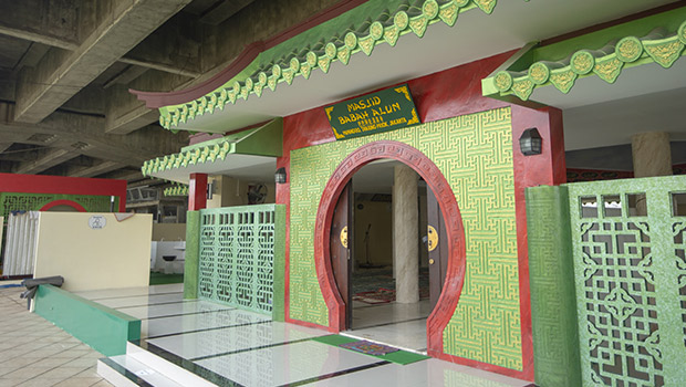 Lantunan ayat-ayat suci mengalun syahdu dari sebuah bangunan di bawah kolong Tol Ir Wiyoto Wiyono. Bangunan tersebut bentuknya unik. Desainnya seperti kelenteng, tetapi berfungsi sebagai masjid. Tempat ini disebut Masjid Babah Alun.