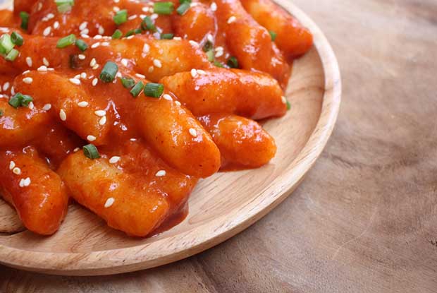 Sementara itu, tteokbokki terbuat dari garaetteok, kue beras berbentuk silinder yang kenyal. Bentuknya mirip dengan pempek lenjer asal Palembang. Garaetteok direbus dengan saus gochujang, pasta cabai yang telah difermentasi asli Korea.