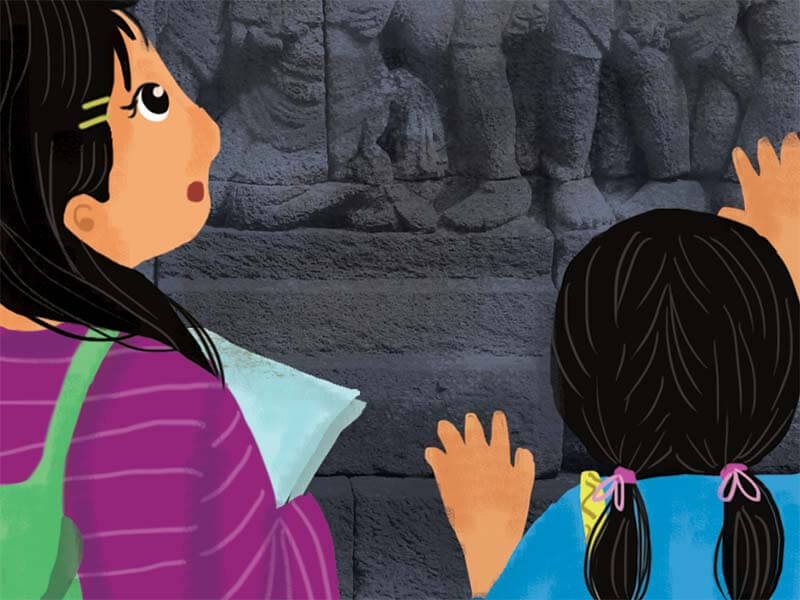 “Ini dia.” Ayah menunjuk ke dinding candi. “Gambar timbul seperti ini dinamakan relief. Pada setiap tingkatan Candi Borobudur, kita bisa menjumpai pahatan relief-relief yang membentuk suatu cerita.”