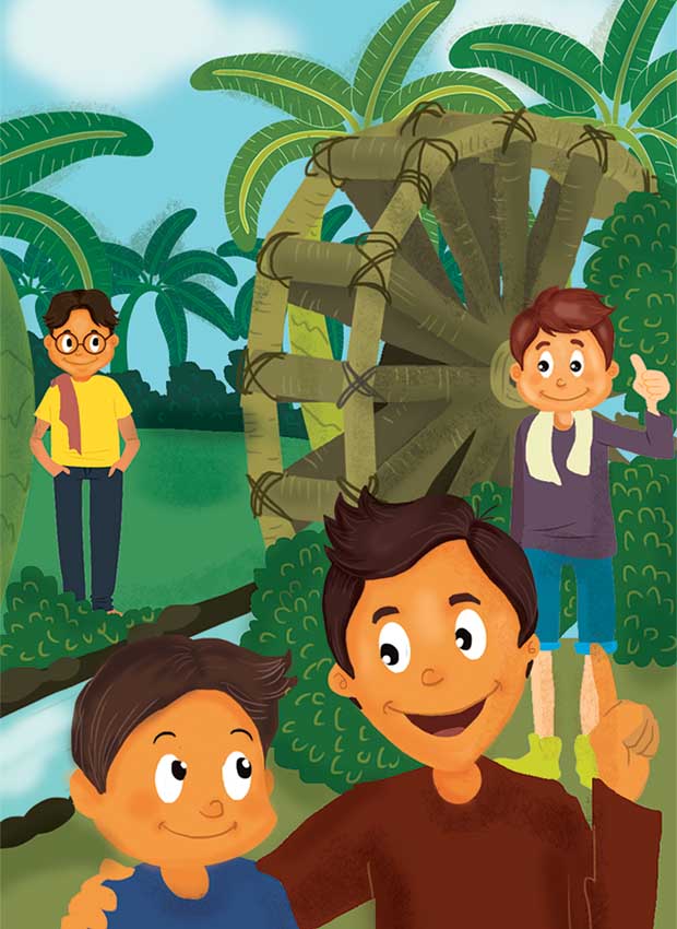 “Nanti air sungai diambil oleh potongan bambu yang menempel di kincir. Potongan bambu akan terus berputar karena dorongan air sungai. Saat bambu berada di atas, air akan ditumpahkan ke talang untuk diteruskan ke sawah,” jelas Ayah dengan sabar.