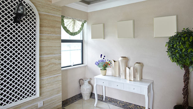 Kemudian ruang tamu. Jika sudut di ruang tamu cukup sempit, letakkan guci atau standing lamp. Jika sudut cukup luas, kita bisa meletakkan lemari kaca berisi pajangan koleksi pribadi, piano, atau minibar.