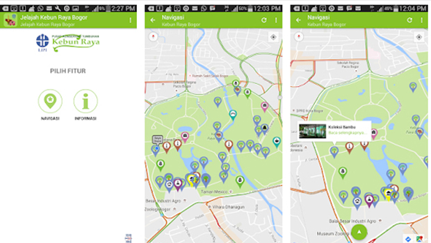 Untuk mempermudah jalan-jalan di KRB, kita bisa mengunduh aplikasi Jelajah Kebun Raya Bogor. Aplikasi ini menyediakan fitur navigasi dan informasi. Aplikasi yang memanfaatkan GPS ini akan menampilkan titik-titik tempat menarik di sana. Kita bisa mendapatkan informasi seputar tempat-tempat di sana. Contohnya, sebelum datang ke Taman Teijsman, kita bisa mendapatkan segala hal tentang tempat tersebut.